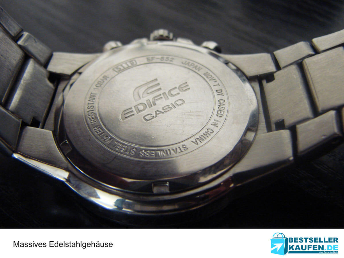 Die Casio Edifice EF-552 ist sehr gut verarbeitet. Das kratzfeste Mineralglas ist resistent gegen unschöne Kratzer und schützt die Uhr hervorragend. Die Glieder des Armband sind sauber verarbeitet. Alle Drehknöpfe zum einstellen des Chronograph funktionieren nach 2 Jahren immer noch wie am ersten Tag.